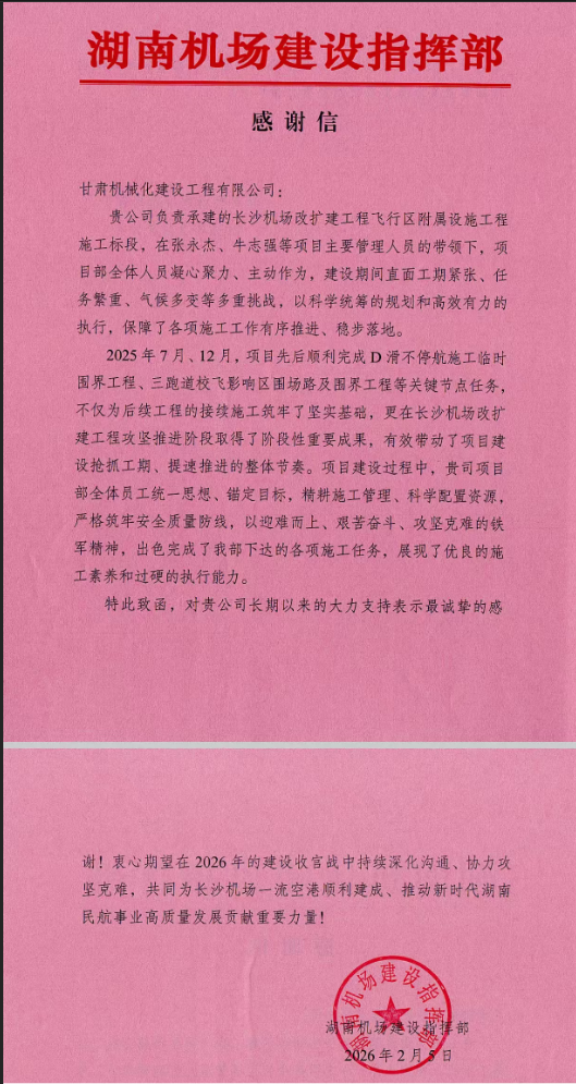 近日,我司接連收到甘肅省民航機(jī)場集團(tuán)、湖南機(jī)場建設(shè)指揮部發(fā)來的感謝信,對我司在蘭州中川國際機(jī)場三期擴(kuò)建工程、長沙機(jī)場改擴(kuò)建工程中的突出表現(xiàn)給予高度評價與誠摯感謝。
