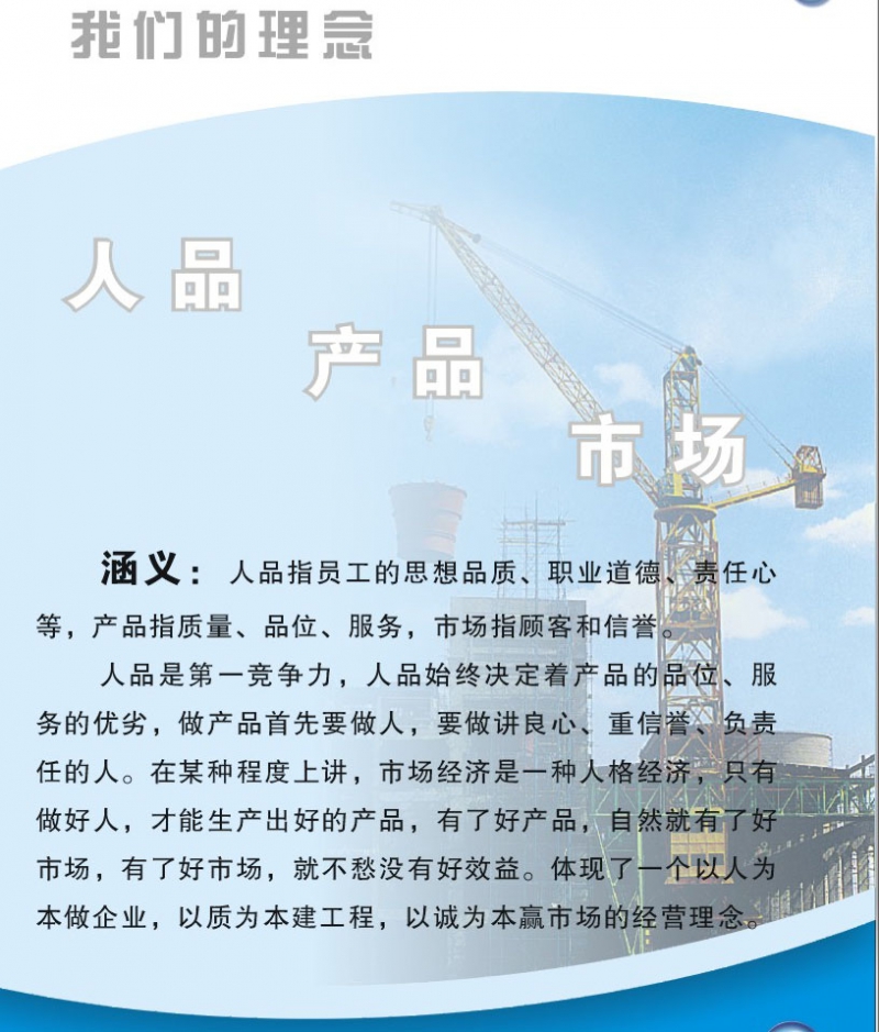 人品是第一競爭力,人品始終決定著產(chǎn)品的品位,服務的優(yōu)劣,做產(chǎn)品首先要做人,要做講良心、重信譽、負責任的人,在某種程度上講,市場經(jīng)濟是一種人格經(jīng)濟,只有做好人,才能生產(chǎn)出好的產(chǎn)品,有了好產(chǎn)品,自然就有了好市場,有了好市場,就不愁沒有好效益。體現(xiàn)了一個以人為本做企業(yè),以質(zhì)為本建工程,以誠為本贏市場的經(jīng)營理念。