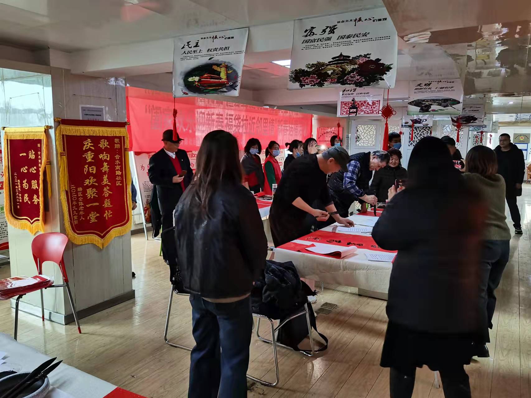 四季青街道合水南路社區(qū)大廳內(nèi),伴隨著喜氣洋洋的音樂(lè),書(shū)法愛(ài)好者們不拘一格、揮毫潑墨,寫(xiě)下一幅幅新春的寄語(yǔ)。
