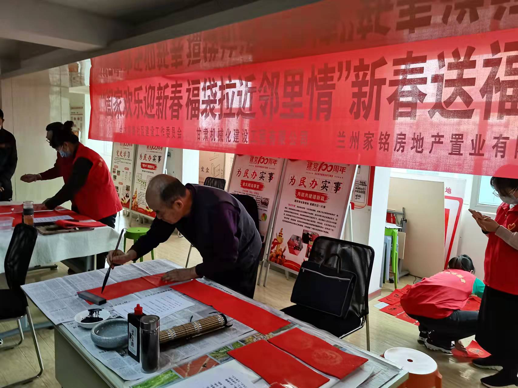 書(shū)法有行、隸、草等多種書(shū)法體,大家相互交流,相互學(xué)習(xí)。書(shū)法愛(ài)好者們將一副副飄著墨香的“?!弊炙偷骄用袷种校瑫r(shí)也把祝福和溫暖送到每位居民的心坎上。