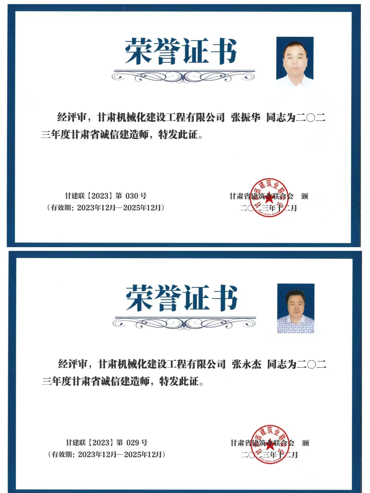 張永杰與張振華兩位同志獲得2023年度甘肅省誠(chéng)信建造師榮譽(yù)稱號(hào)。