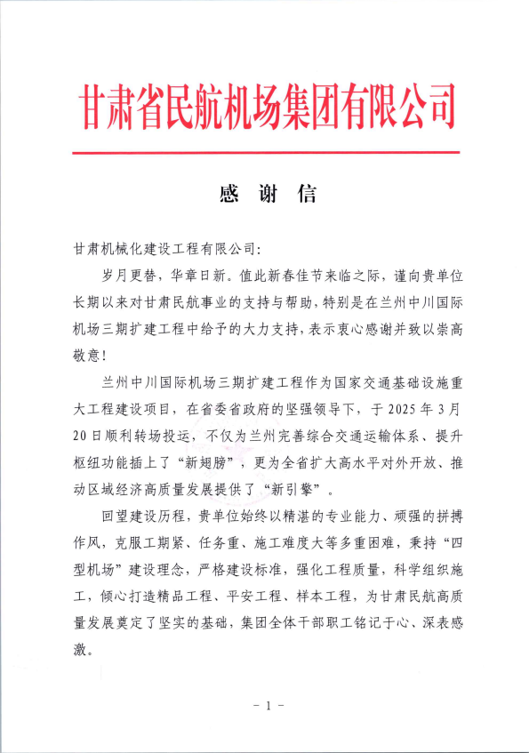 近日,我司接連收到甘肅省民航機(jī)場(chǎng)集團(tuán)、湖南機(jī)場(chǎng)建設(shè)指揮部發(fā)來的感謝信,對(duì)我司在蘭州中川國(guó)際機(jī)場(chǎng)三期擴(kuò)建工程、長(zhǎng)沙機(jī)場(chǎng)改擴(kuò)建工程中的突出表現(xiàn)給予高度評(píng)價(jià)與誠(chéng)摯感謝。